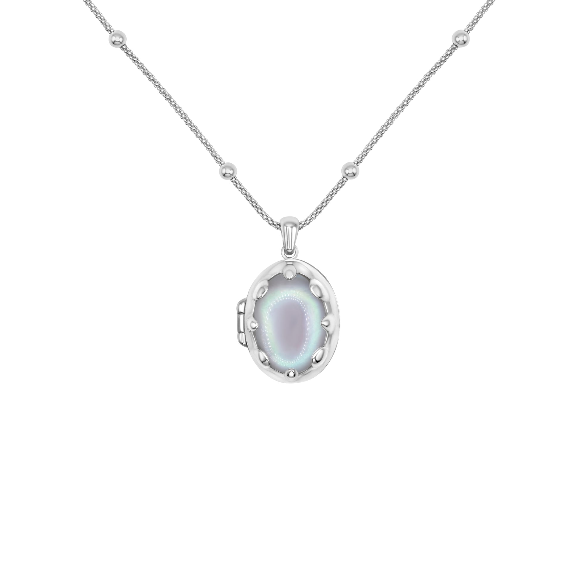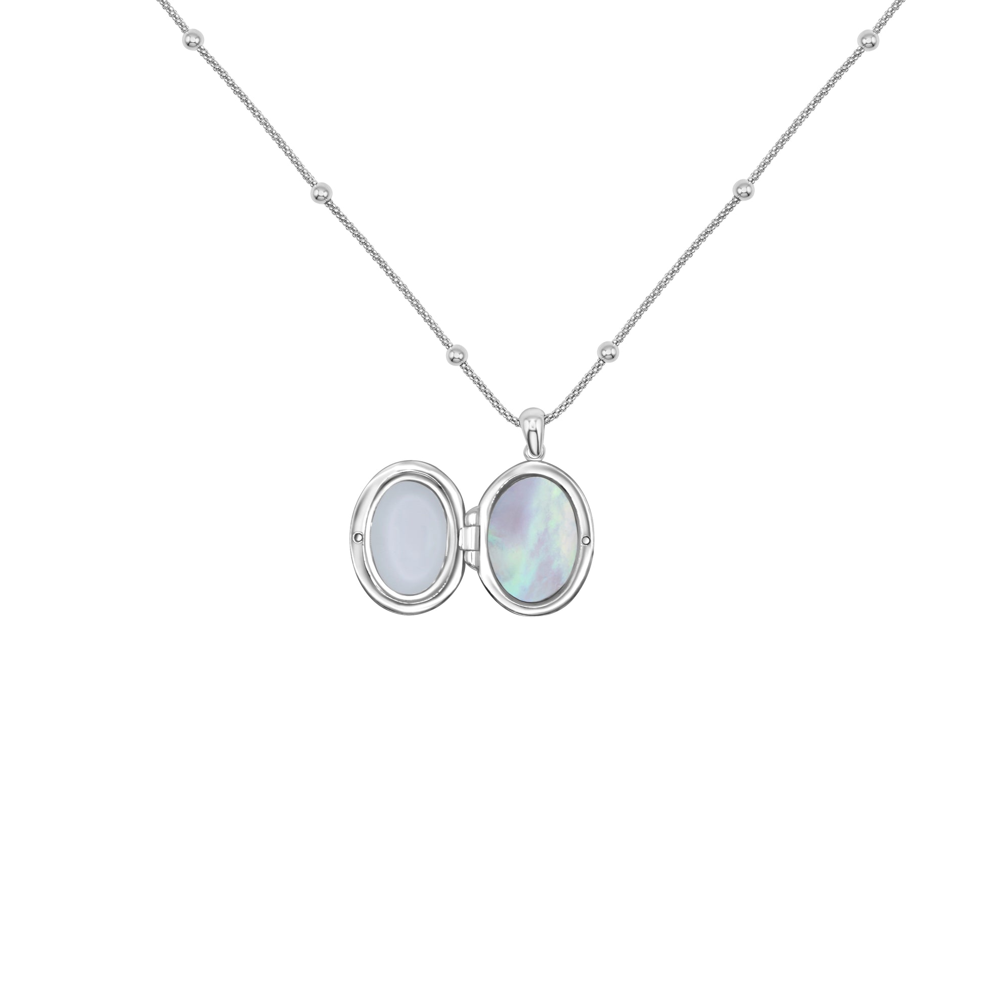 Solid 925 sterling silver petal locket featuring a quarts crystal face with a mother of pearl interior and magnetic closure. Choose between 17.5" or 19.5" Chain.