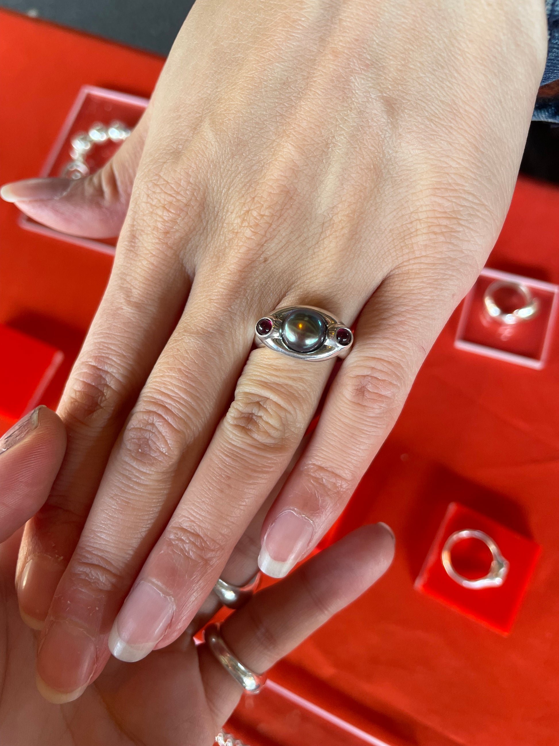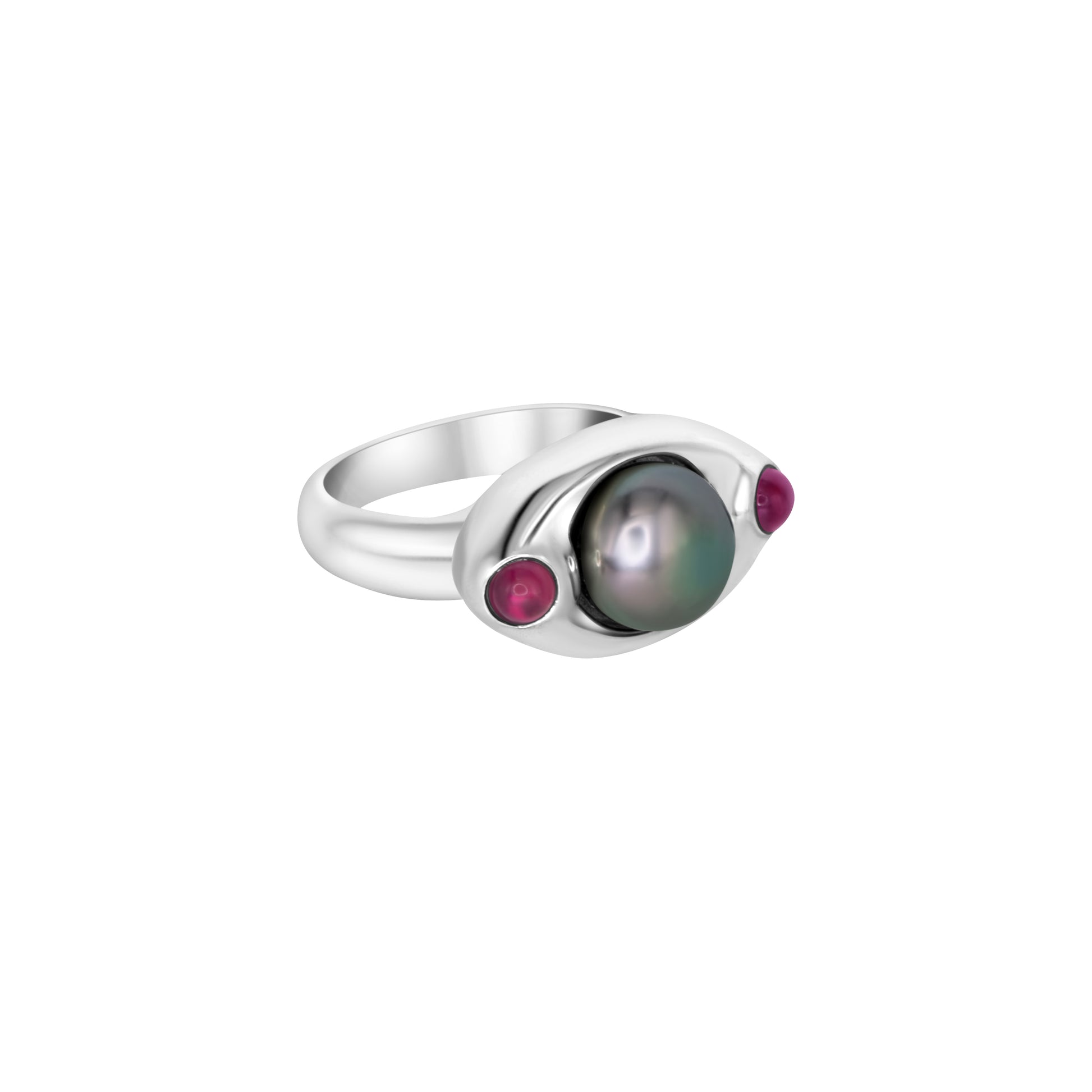Solid 925 sterling silver ring featuring two rhodolite garnets and a natural freshwater cultured pearl.
